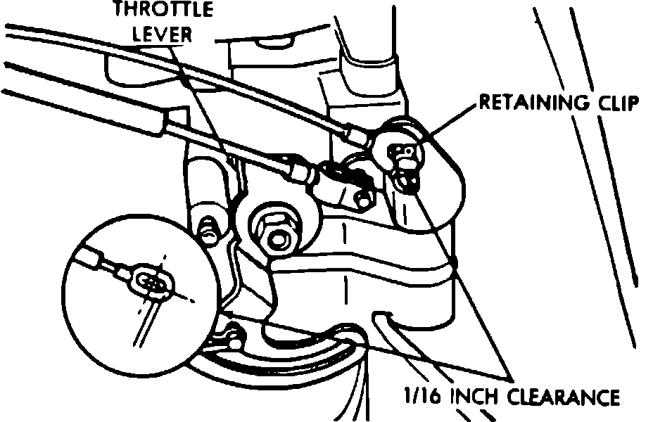 c. Adjust clip until 1/16 inch clearance is achieved between throttle stud and cable clevis.
