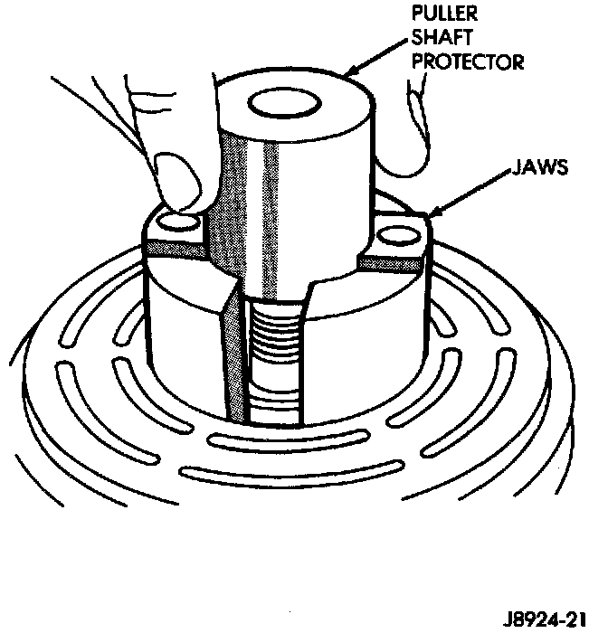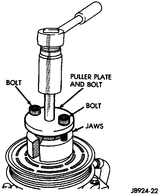 8. Install the puller through-bolts (Special Tool C-6461) through the puller flange and into the jaws of the rotor puller and tighten. Turn the puller center bolt clockwise until the rotor pulley is free.