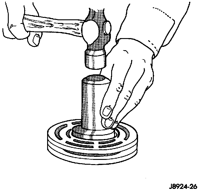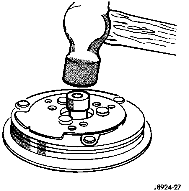 9. Install the clutch plate. Use the shaft protector (Special Tool 6141-2 in Kit 6460) to install the clutch plate on the compressor shaft. Tap the clutch plate over the compressor shaft until it has bottomed against the clutch shims. Listen for a distinct change of sound during the tapping process, to indicate the bottoming of the clutch plate.