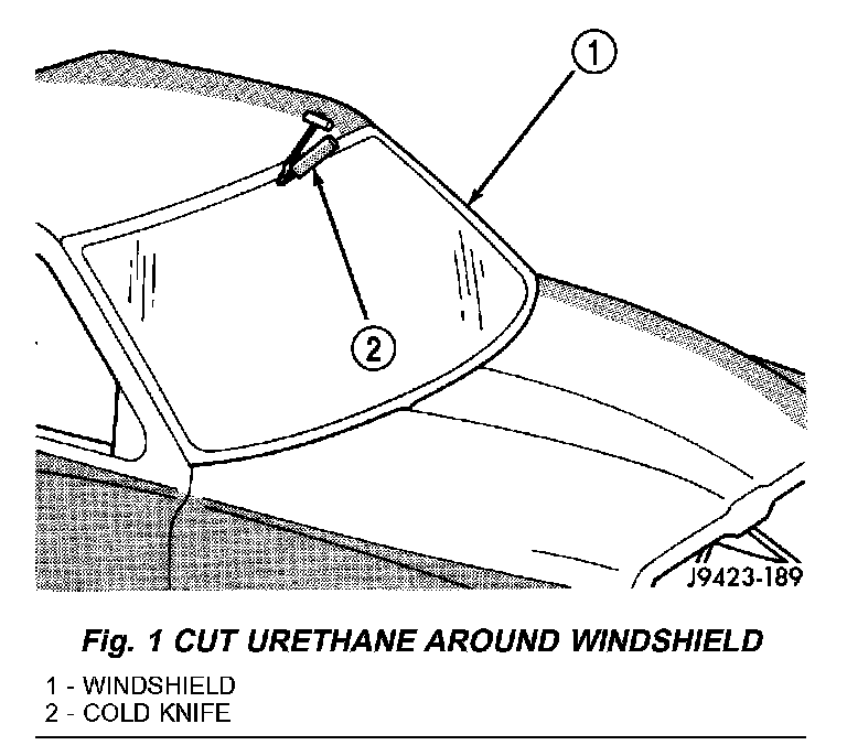 5. Cut urethane bonding from around windshield using a suitable sharp cold knife (Fig. 1).