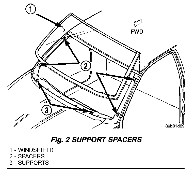 NOTE: The windshield fence should be cleaned of most of its old urethane bonding material. A small amount of old urethane, approximately 1-2 mm in height, should remain on the fence. Do not grind off or completely remove all old urethane from the fence, the paint finish and bonding strength will be adversely affected. Support spacers located on the cowl at the bottom of the windshield opening (Fig. 2) should be replaced with new parts. Replace any missing or damaged spacers around the perimeter of the windshield opening.