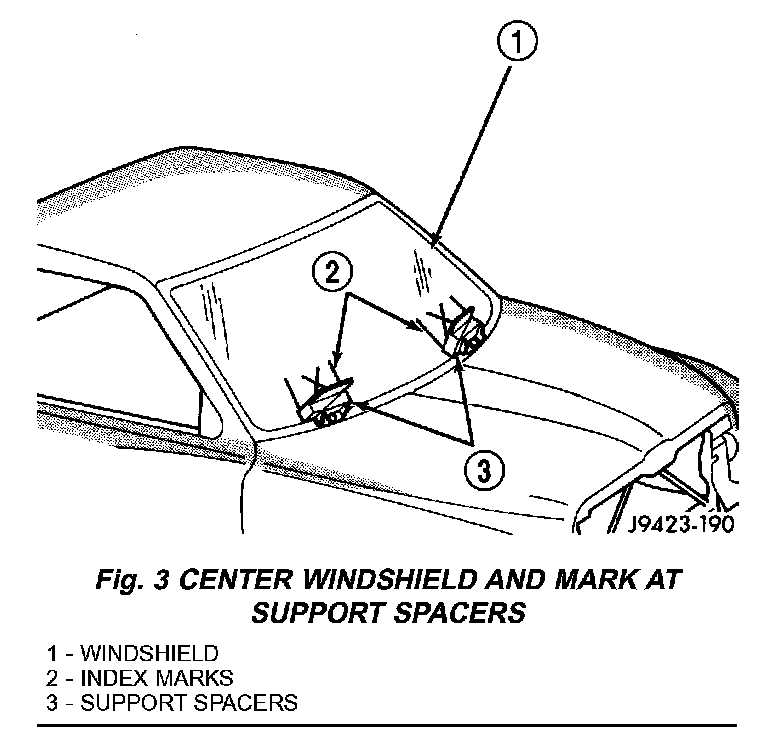 1. Place replacement windshield into windshield opening and position glass in the center of the opening against the support spacers. Mark the glass at the support spacers with a grease pencil or pieces of masking tape and ink pen to use as a reference for installation. Remove replacement windshield from windshield opening (Fig. 3).