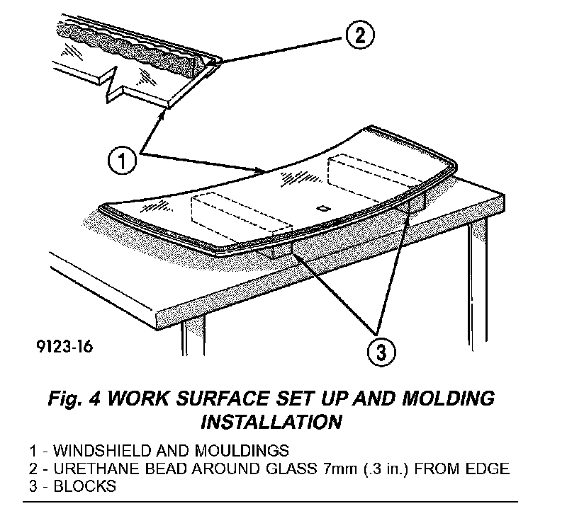 2. Position the windshield inside up on a suitable work surface with two padded, wood 10 cm by 10 cm by 50 cm (4 in. by 4 in. by 20 in.) blocks, placed parallel 75 cm (2.5 ft.) apart (Fig. 4).
