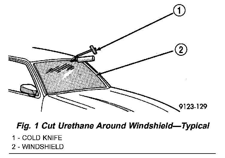 4. Cut urethane bonding from around windshield using a suitable sharp cold knife. A pneumatic cutting device can be used if available (Fig. 1).