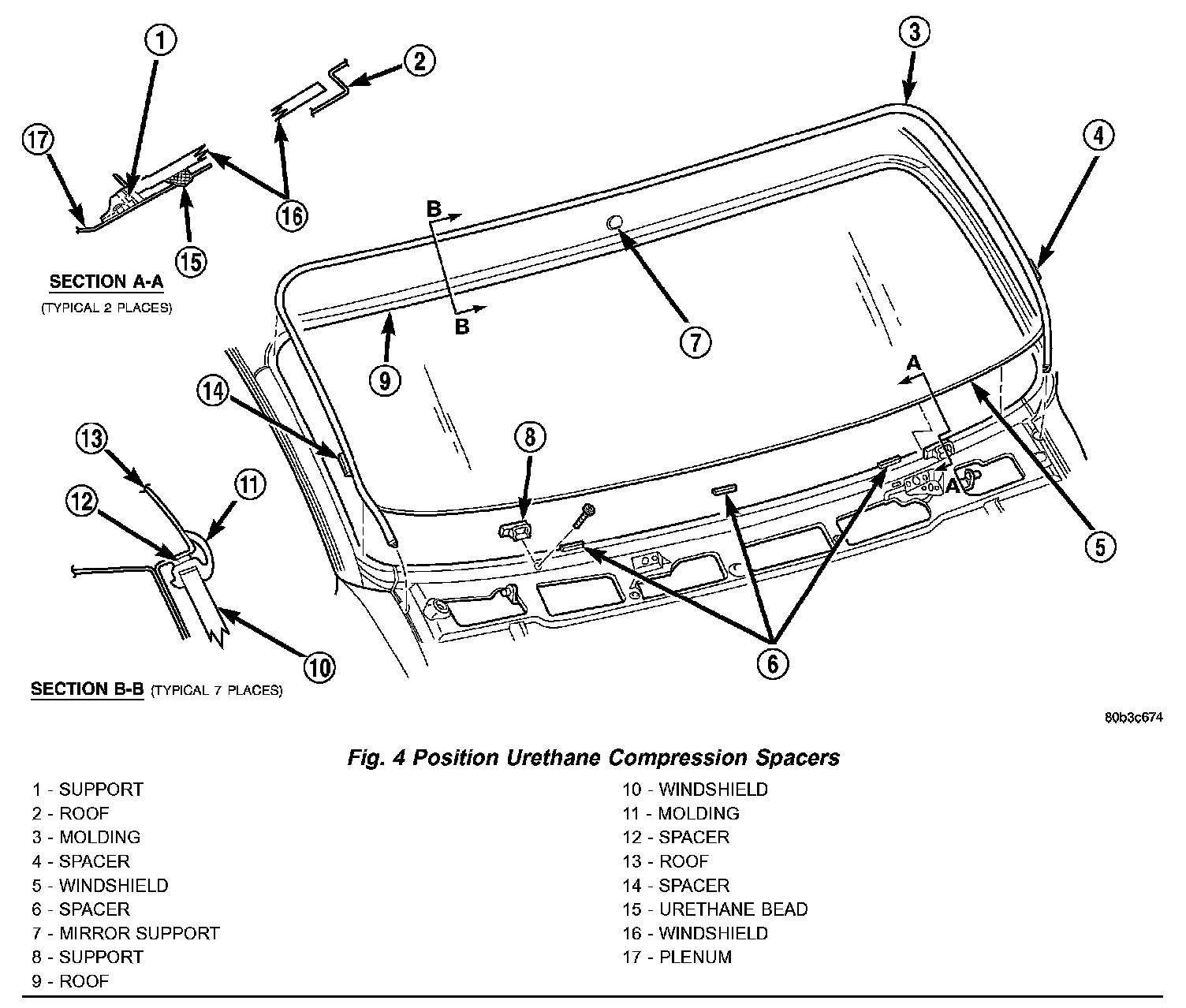 9. Position windshield spacers on lower fence above support spacers at the edge of the windshield opening (Fig. 4).