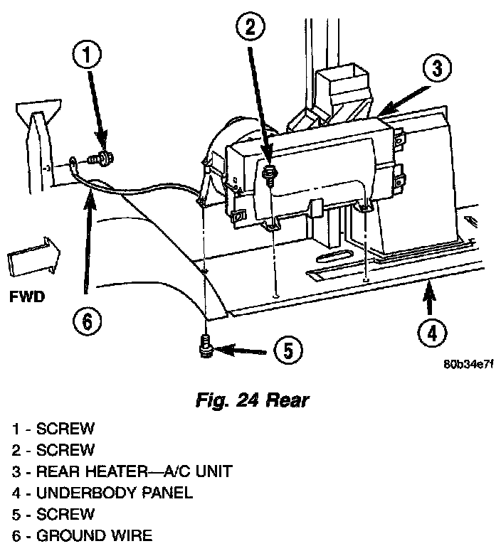 4. Remove the one screw that secures the rear heater-A/C unit to the underbody panel from underneath.