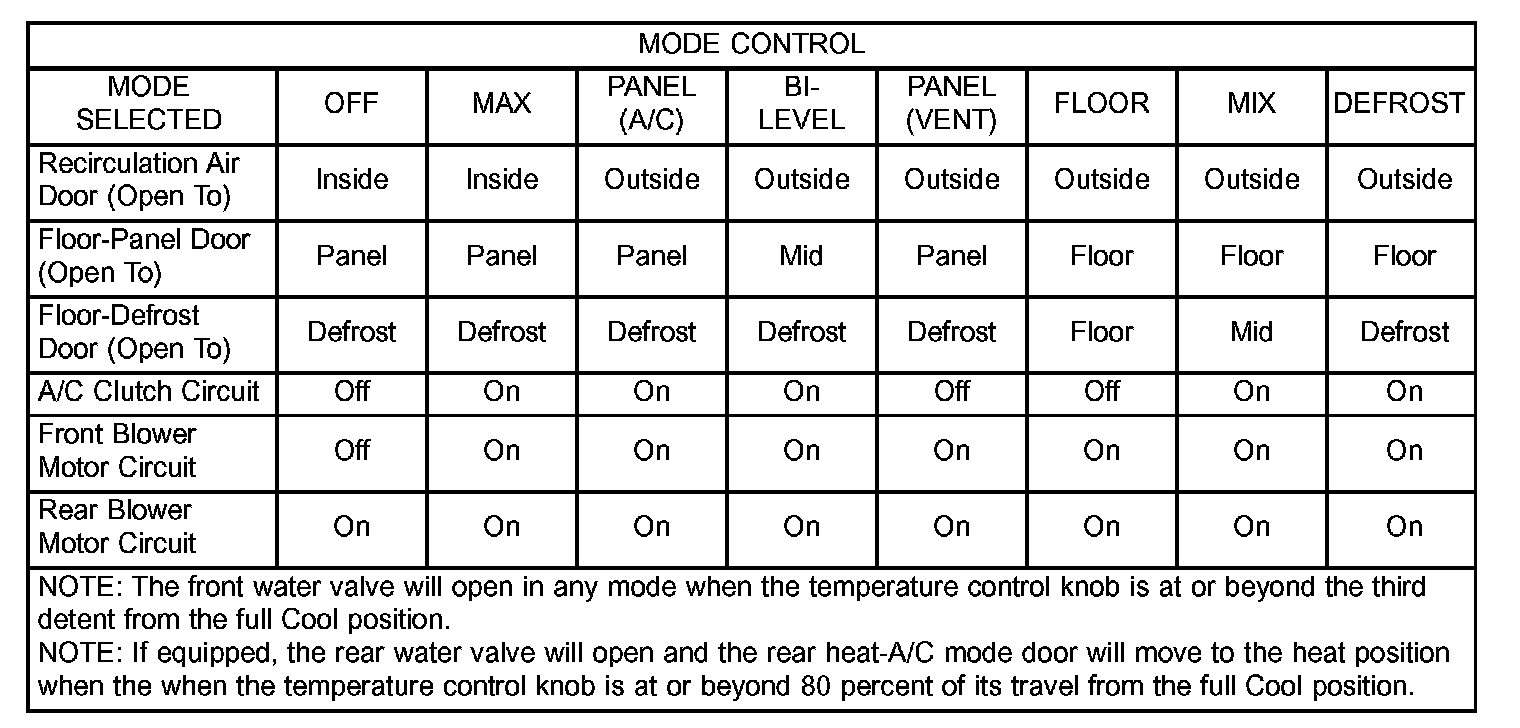3. Move the temperature control knob to the full counterclockwise (Cool) position and place the mode control knob in the Bi-Level position. The outside (recirculation) air door should be open to outside air.If not OK.