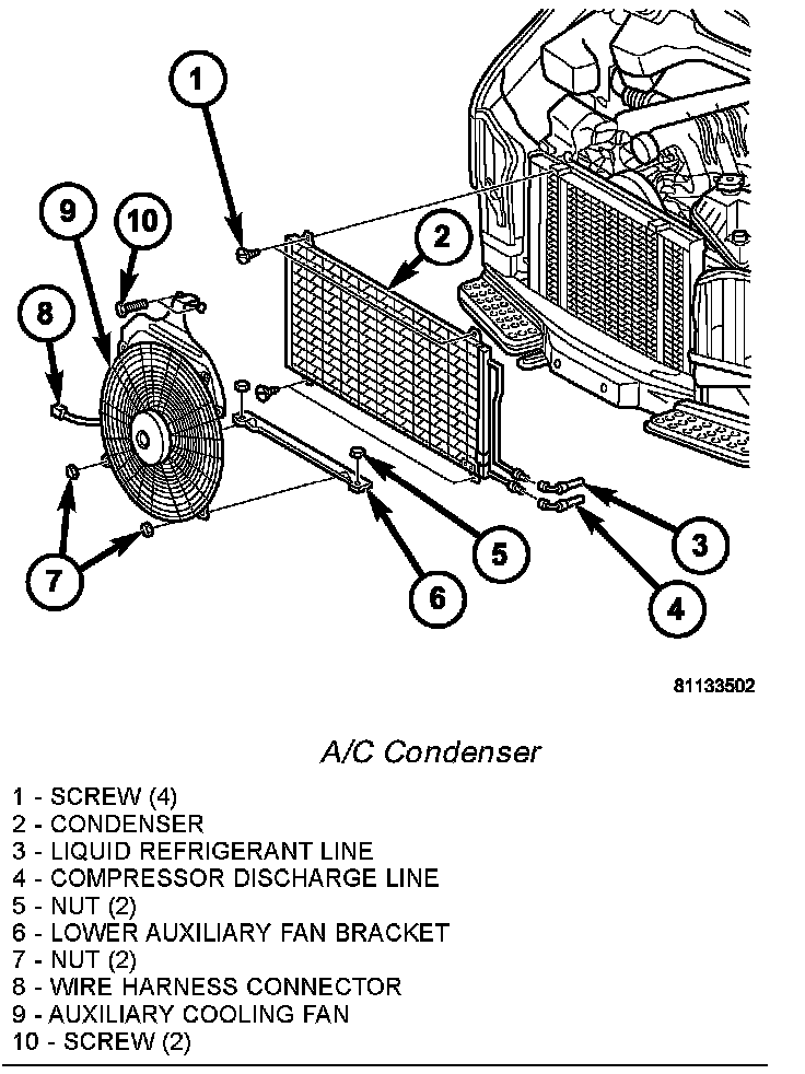 NOTE: If the condenser is being replaced, add 30 milliliters (1 fluid ounce) of refrigerant oil to the refrigerant system. Use only refrigerant oil of the type recommended for the compressor in the vehicle.