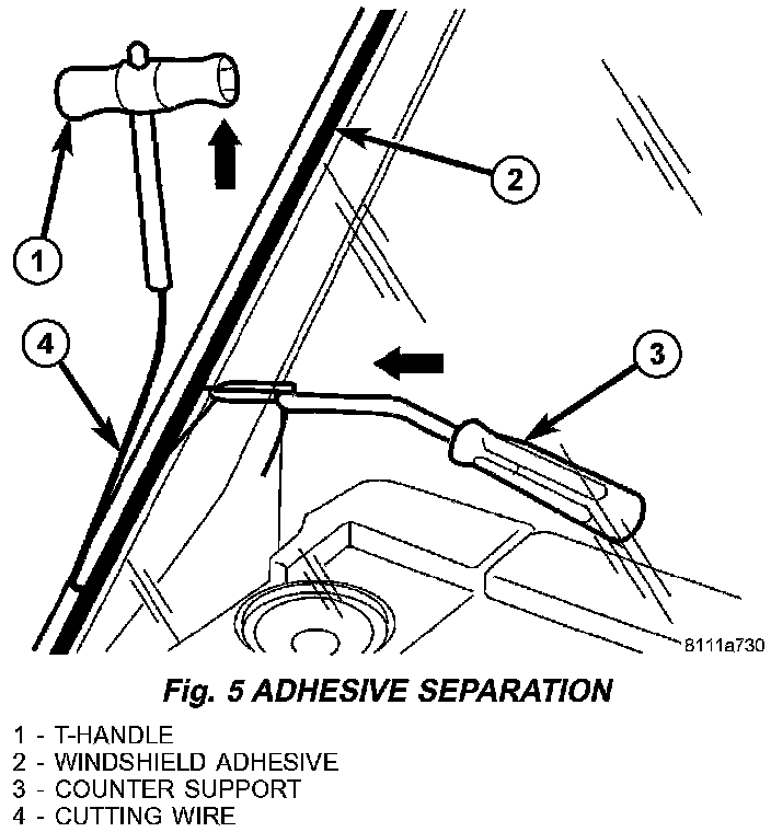 6. Using a windshield cut-out wire separate the adhesive. (Fig. 5)