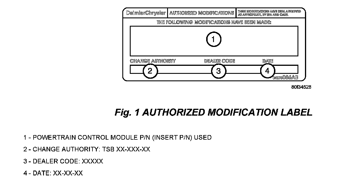 6. Type the necessary information on the "Authorized Modification Label" p/n 04275086AB and attach near the VECI label (Fig 1).