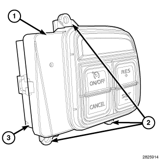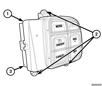 The switch pod housing and push buttons are constructed of molded plastic. Each of the push buttons has white International Control and Display Symbol graphics or text applied to it, which clearly identify the function of each push button. The switch pod is secured through three integral mounting tabs (2) and a molded plastic mounting adapter plate to the mounting bosses on the back of the spoke bezel by three screws. The mounting adapter plate is secured to the steering wheel spoke by a single screw installed through a clearance hole in the rear trim cover of the steering wheel. A connector receptacle (3) integral to the inboard end of the switch pod housing connects the speed control switch and the Local Interface Network (LIN) slave node circuitry integral to the switch pod to the vehicle electrical system through a dedicated take out and connector of the steering wheel wire harness.