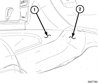 2. Pull the right side floor carpet (2) back from under the center dash area.