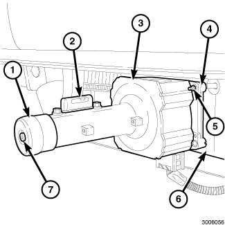 1. The adaptive speed control sensor (4) (also known as the Adaptive Cruise Control/ACC sensor or module and the radar sensor or module) is located on a bracket (6) secured near the center of the underside of the front bumper support member of the Front End Module (FEM) behind the front fascia.