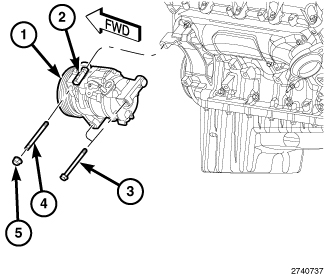 3. Loosely install the two bolts (3) and one nut (5) that secure the A/C compressor to the engine.