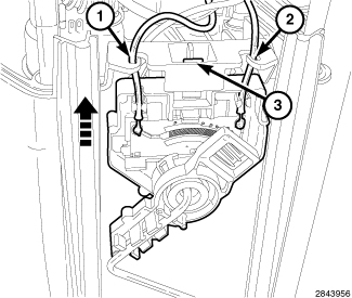 1. Position the fuel level sending unit to the fuel pump module, slide unit on mounting track until the plastic locking tab (3) snaps into position.