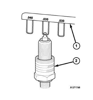 2. Check and adjust the spark plug gap with a gap gauging tool (1). Spark Plug Specifications