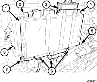 1. Position the Memory Seat Module (MSM) (1) to the driver seat and engage the two front retaining tabs (2 and 4) to the bracket (8).