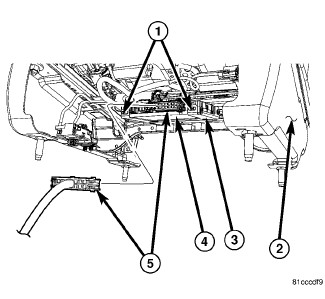 The Memory Seat Module (MSM) (4) is located underneath the middle of the driver seat (2). It is used in conjunction with the other modules in the memory system to recall the driver seat to one of two preset seat positions (horizontal, vertical, and recliner). The switch for the memory seat programming and selection mounts on the driver door trim panel. The memory system is able to store and recall all driver side power seat positions, outside mirror positions and power adjustable pedal position. The system can be set for two different drivers. On vehicles with a factory installed radio connected to the Controller Area Network (CAN) data bus network, the memory system is also able to store and recall up to twelve radio station presets (six AM and six FM), also for two drivers. The memory system will also store and recall the last station listened to for each driver, even if it is not one of the twelve preset stations.
