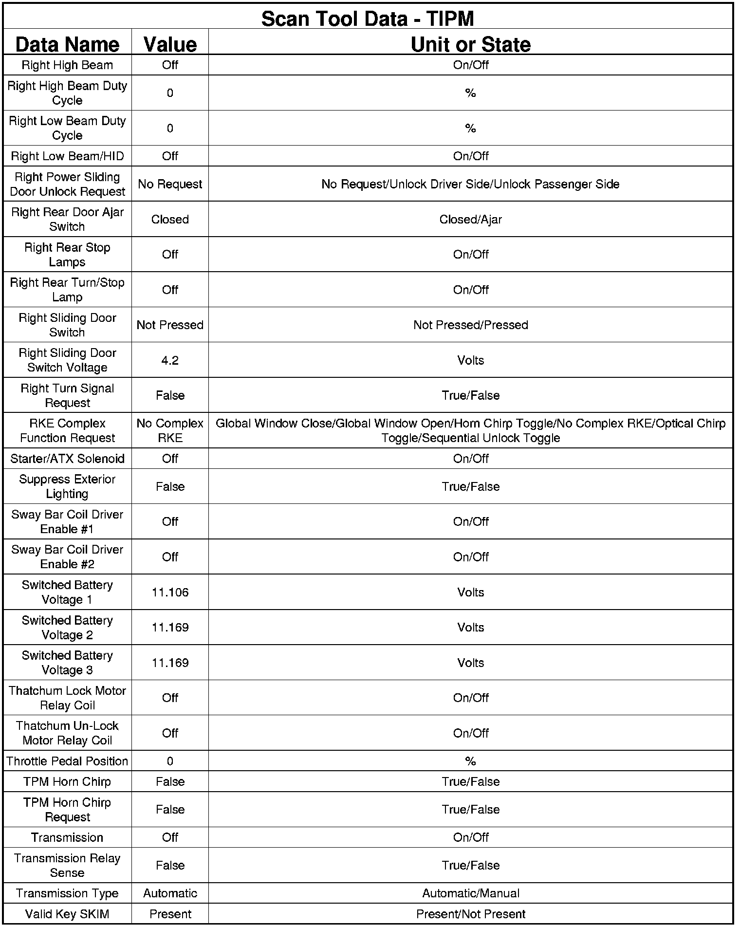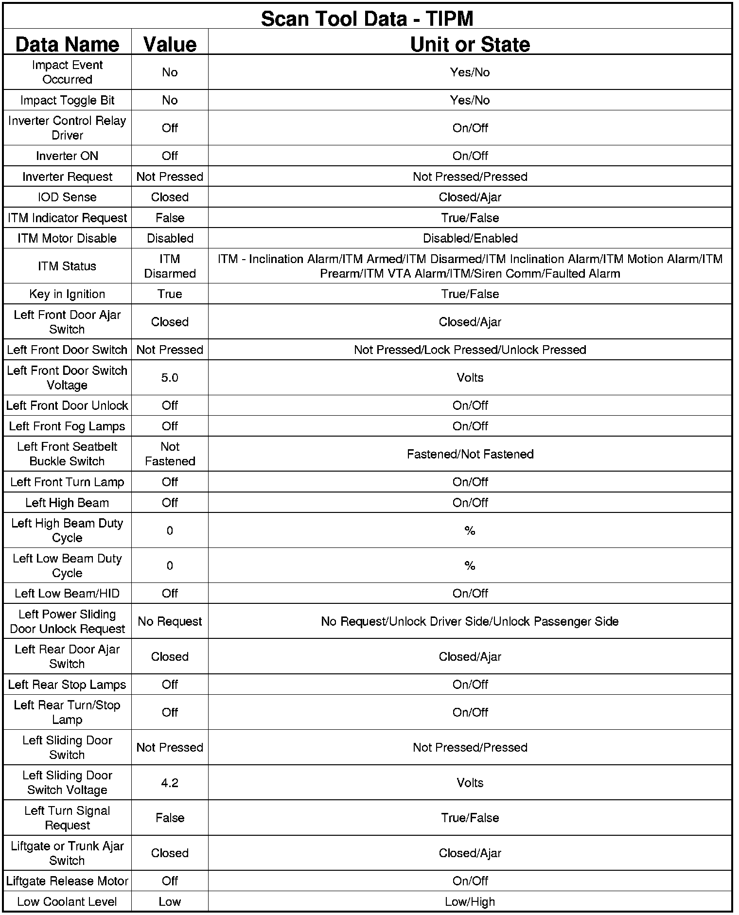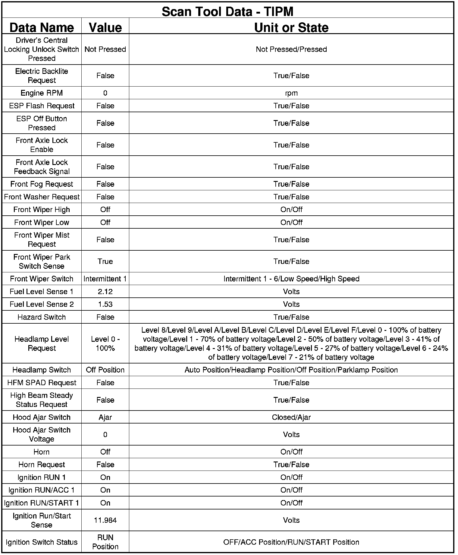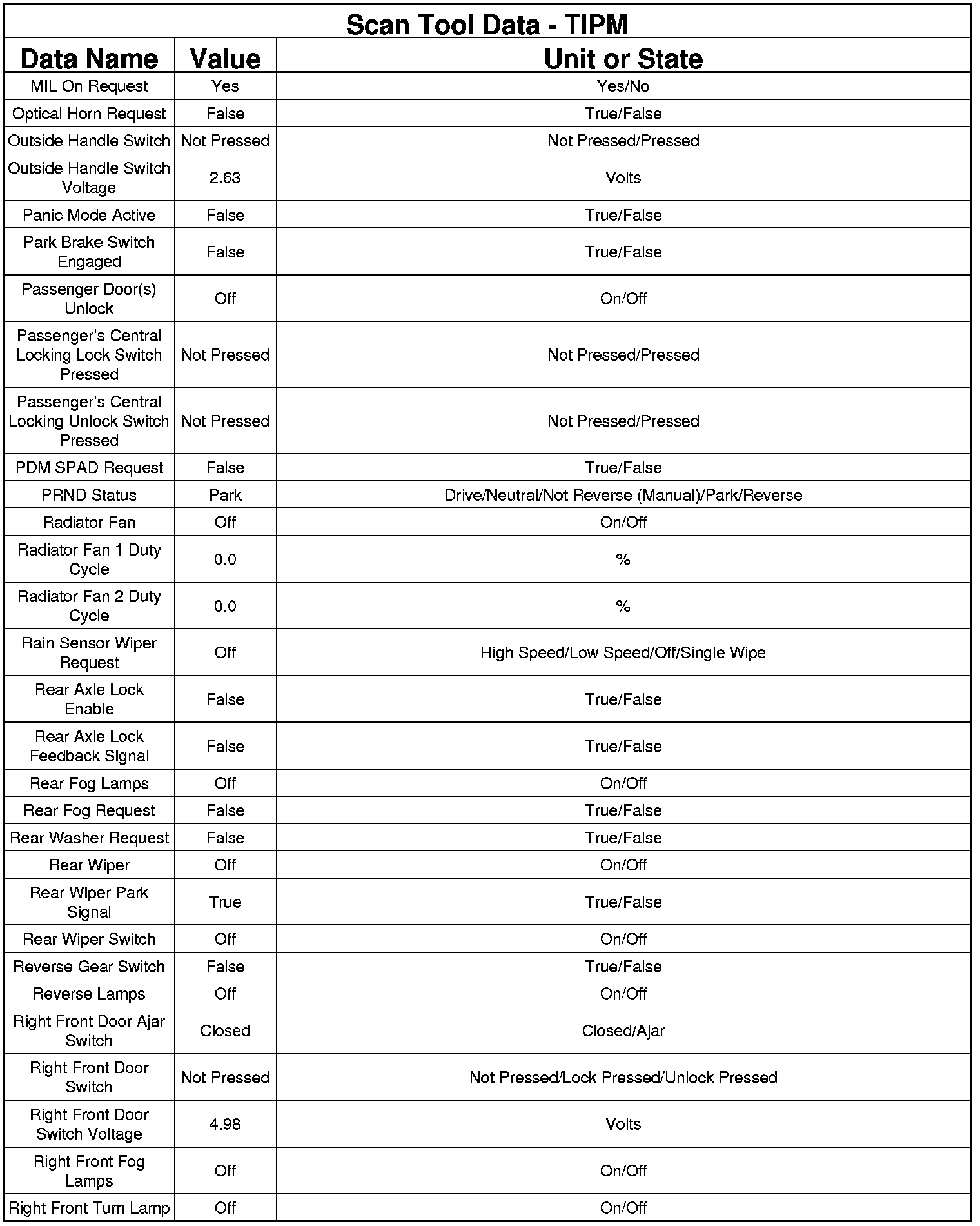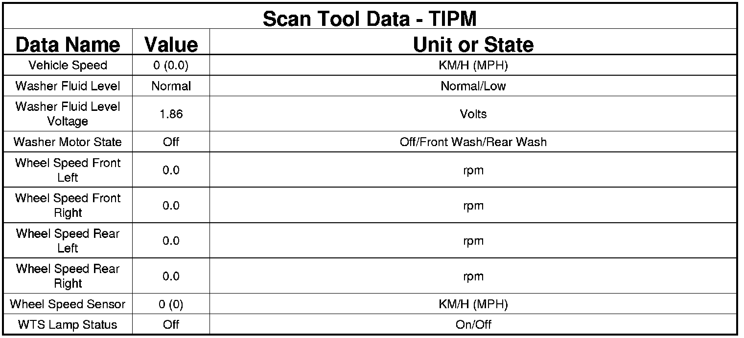 The following chart lists data values taken from the Scan Tool Totally Integrated Power Module (TIPM) data list. The data is to be used for reference only.