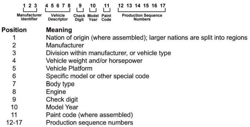 Each character in a VIN has a specific meaning, and the VIN is broken up into sections. The following image (courtesy of howstuffworks.com) shows the 17 placeholders, described in detail below.
