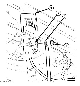 4. Remove the protective cover (1) over the remote jump-start positive battery post (2) (+) in the engine compartment. Connect one end of the jumper cable to the positive battery post (2). Connect the other end of the same cable to the positive terminal of the booster battery.