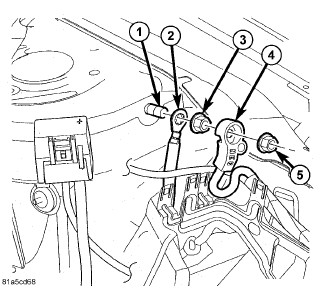 NOTE: The battery is stored in a compartment that is located behind the left front fender and is accessible through the wheel well. Remote jump-start terminals are located in the engine compartment.