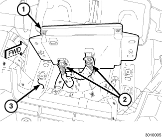 4. Disconnect the two wire harness connectors (2) and remove the A/C heater module (1) from the instrument panel support (3).