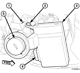 1. Position the Sentry Key REmote Entry Module (SKREEM) (3) (also known as the Sentry Key Immobilizer Module/SKIM or the Wireless Control Module/WCM) onto the steering column ignition lock housing with the antenna ring oriented around the lock cylinder (5).