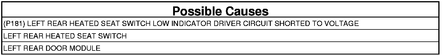 - Repair the (P181) Left Rear Heated Seat Low Indicator Driver circuit for a short to battery.