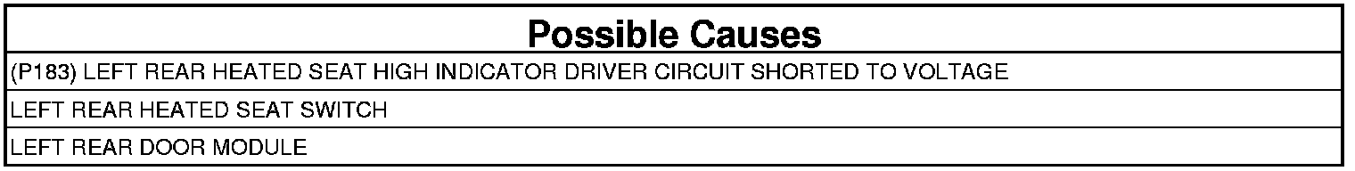 - Repair the (P183) Left Rear Heated Seat High Indicator Driver circuit for a short to battery.