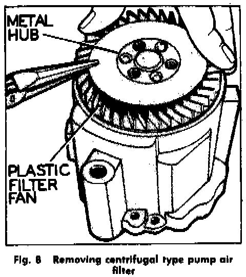 1. To replace filter, Fig. 8, remove drive belt and pump pulley. Pry loose outer disc of filter fan, being careful to prevent fragments from entering the air intake hole.