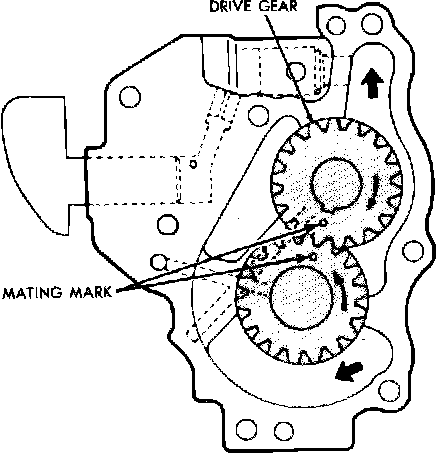 Align mating marks of drive and driven gears, then prime pump with clean oil and install onto engine.