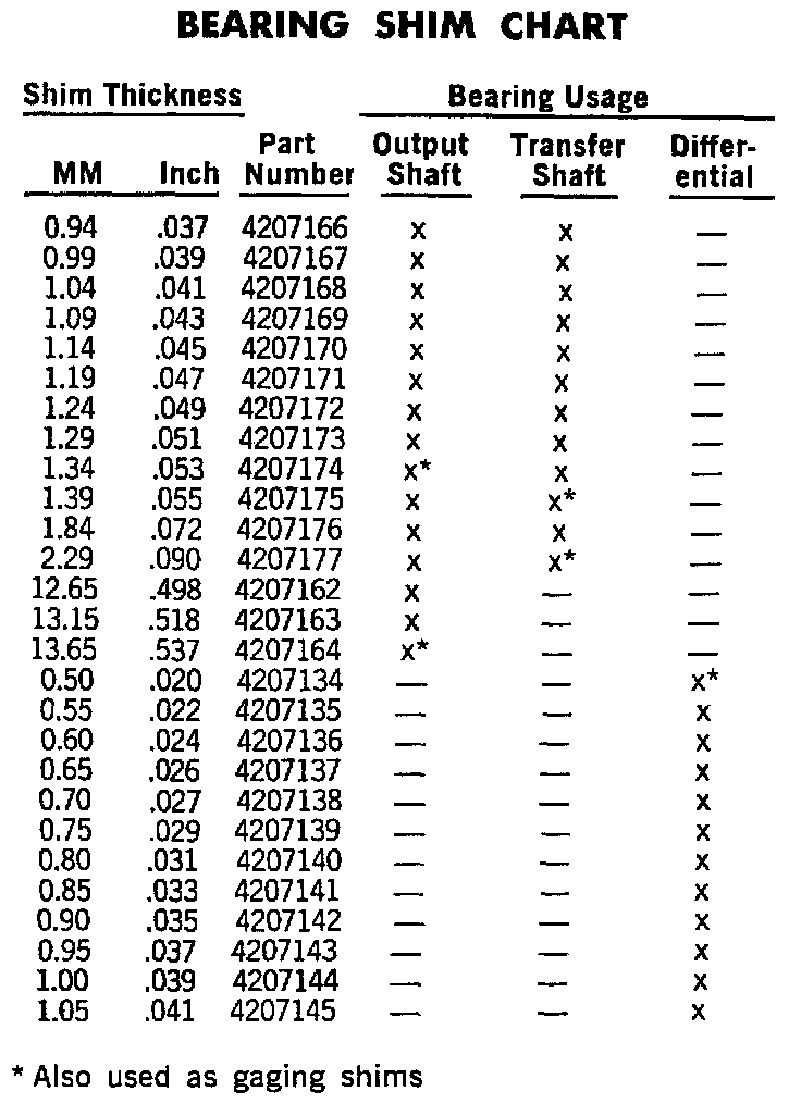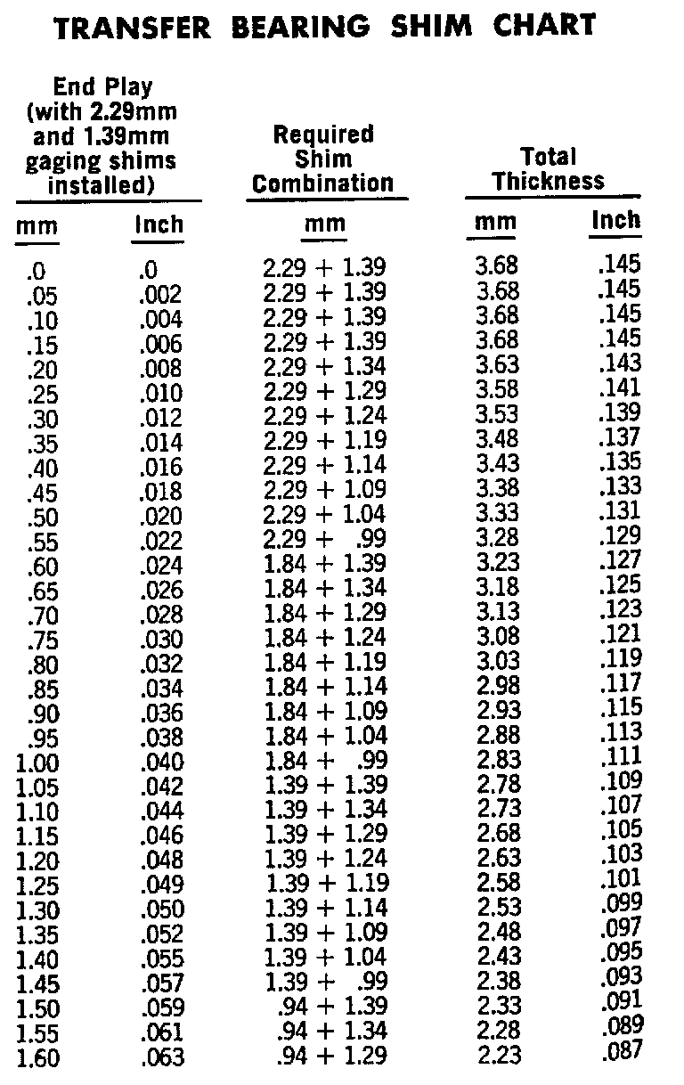 Transfer Bearing Shim Chart: