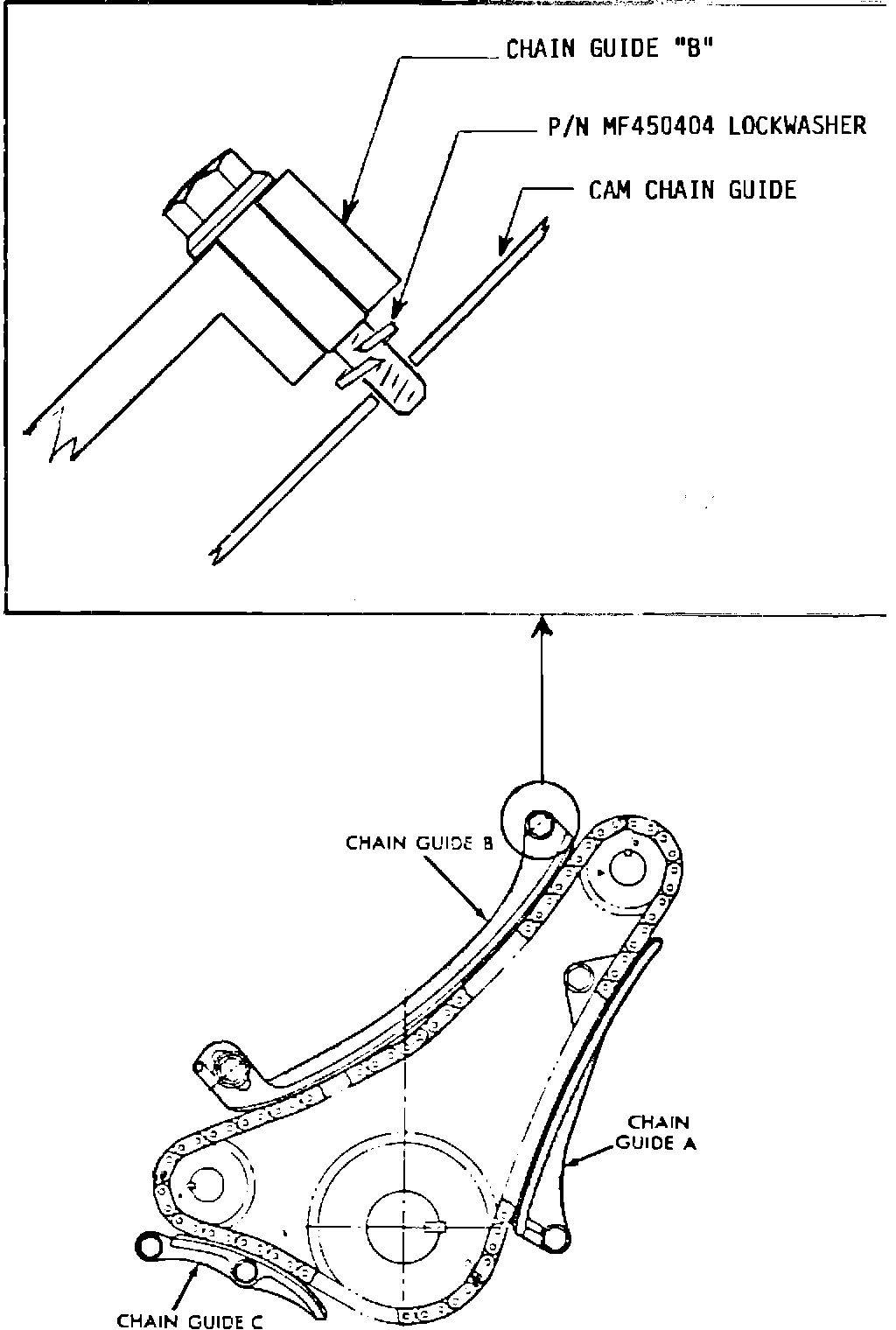 2. Lockwasher, PN MF450404, may also be missing from between silent shaft chain guide "B" pivot bolt and timing chain guide (Figure 3)..