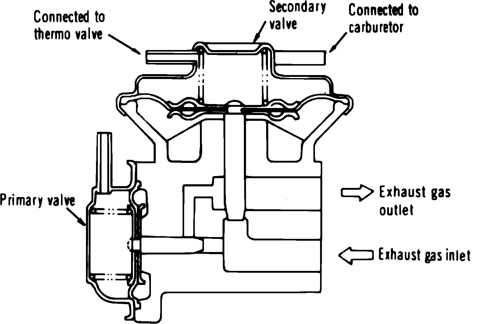 The single type EGR Control Valve, Fig. 7, is operated by carburetor vacuum in response to throttle valve opening. EGR flow is not available at idle or wide open throttle operation. The dual type EGR Control Valve, Fig. 8, consists of primary and secondary valves which are operated by different carburetor vacuums in response to throttle valve opening. The primary valve controls EGR flow when the throttle valve is slightly open, while the secondary valve controls EGR flow during wider throttle openings. EGR flow is not available at idle or wide open throttle operation.