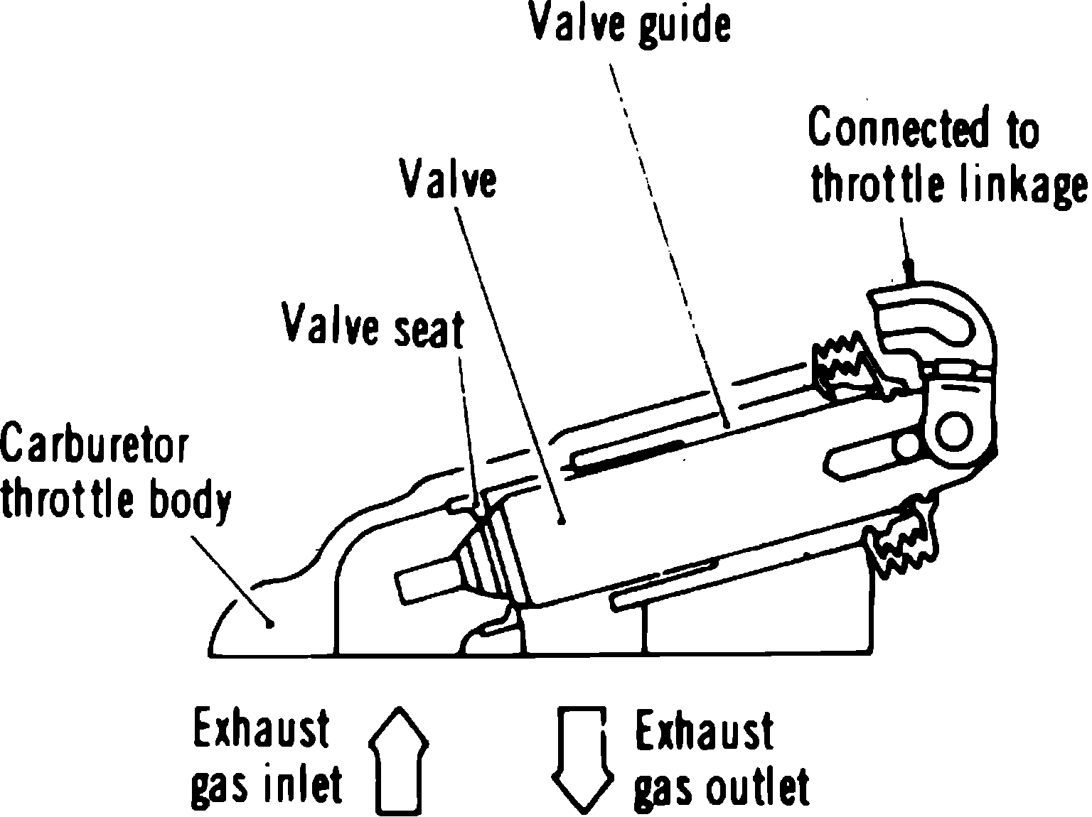 The Sub-EGR Control Valve, Fig. 9, modulates EGR flow according to throttle opening. It is mechanically connected to the throttle linkage and opens and closes with the motion of the throttle valve.