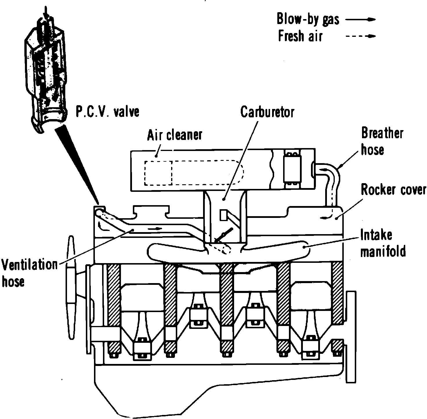 This system incorporates a PCV valve which is located at the rocker arm cover. With this system, fresh air is routed from the air cleaner to the front of the valve cover and into the crankcase where the fresh air is mixed with the blow-by gasses. The mixture of fresh air and blow-by gasses then passes through the PCV valve and is drawn through a hose to the intake manifold and to the combustion chamber. Under high speed or during acceleration conditions, the blow-by gasses are drawn through the PCV valve to the intake manifold and through the breather to the air cleaner and routed into the combustion chamber.
