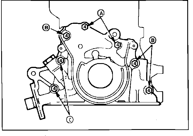 3. Reverse procedure to install. When installing timing case attaching bolts, refer to Fig. 31 and note that bolts to be installed in location A are 1.18 inch in length, bolts installed in location B are .79 inches in length and bolts installed in location C are 2.36 inches in length. When installing oil seal, lubricate seal lips with engine oil, then position seal on crankshaft and tap into timing case using tool No. MD998306. Before installing oil pan, apply sealer at the four front timing case and rear oil seal case to cylinder block mating surfaces. Torque front timing case attaching bolts to 9-10 ft. lbs. and oil pan attaching bolts to 4.5-5.5 ft. lbs.