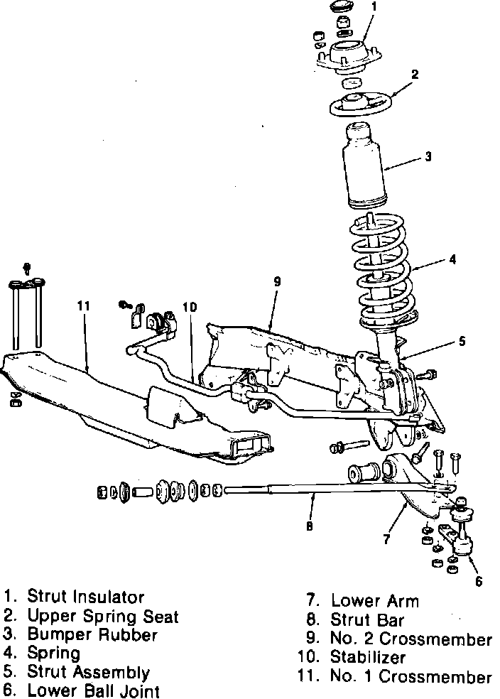 4. Reverse procedure to install. Torque lower control to crossmember, strut bar to lower control arm and ball joint to lower control arm attaching bolts to 69 to 87 ft. lbs.