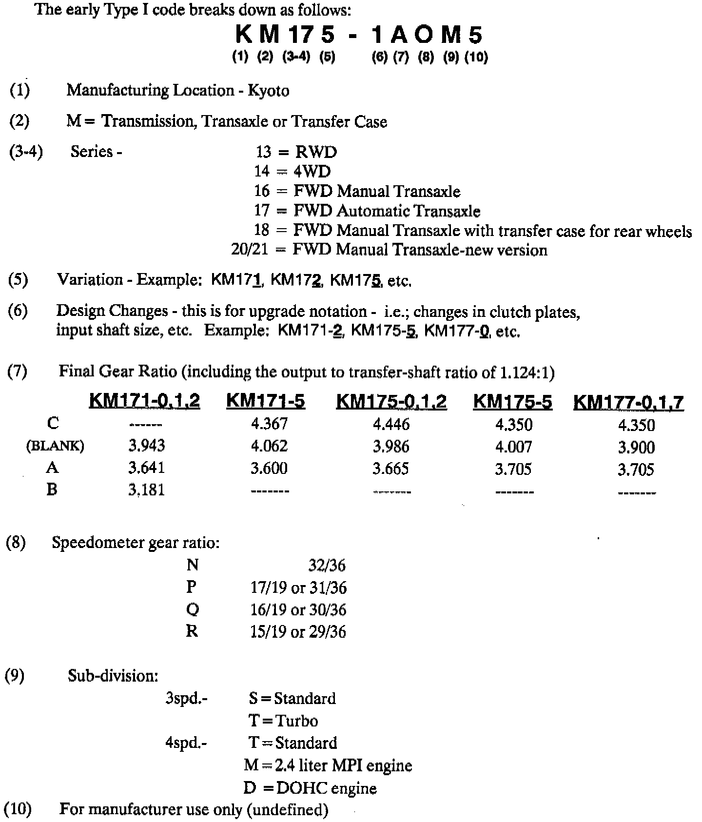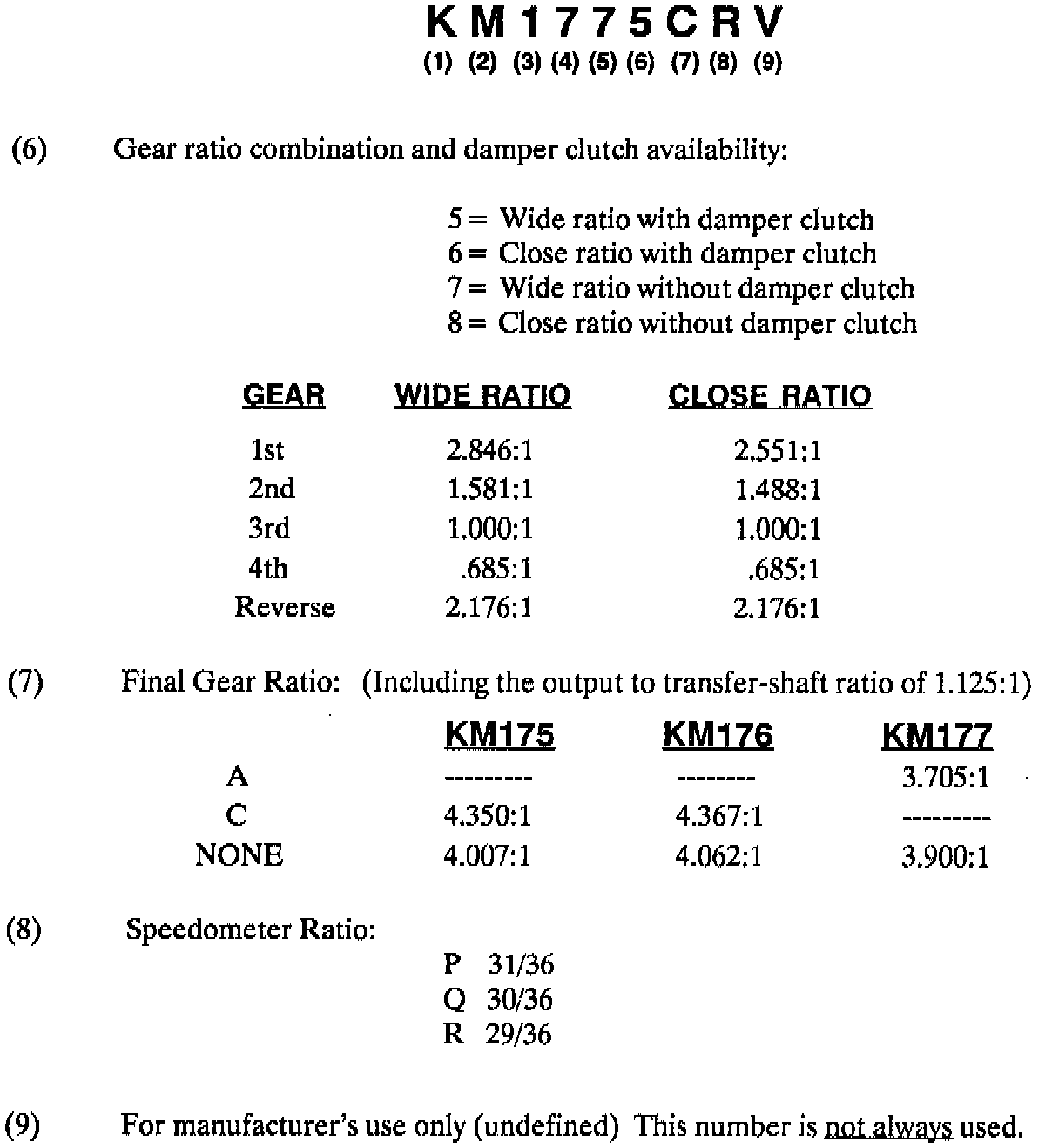 Beginning with the 1990 models, the KM170 Series Transaxles were given new coding. You will find the late code on the top of the case, or below the manual shaft. Figure 2 shows you an example of the new coding.