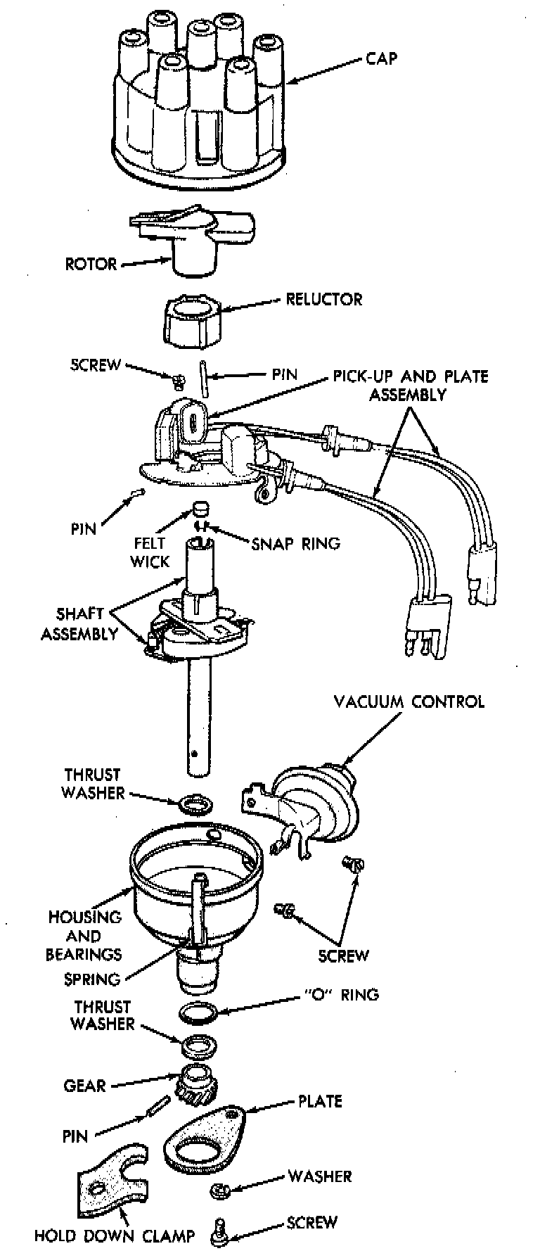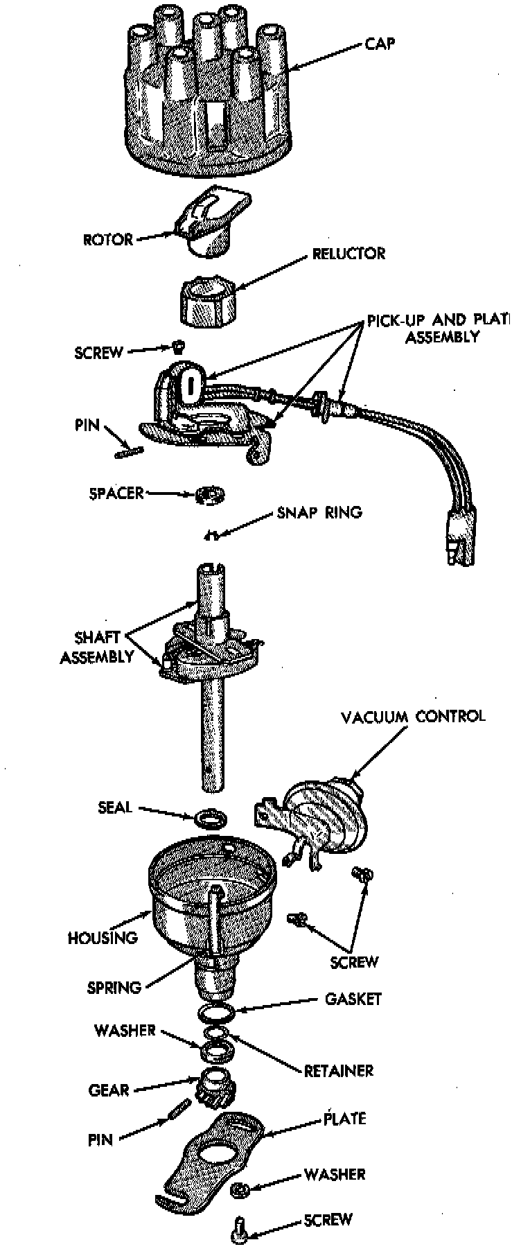3. Remove two screws and lockwashers attaching lower plate to distributor housing, then lift out lower plate, upper plate and pick-up coil as an assembly. Do not remove distributor cap clamp springs.