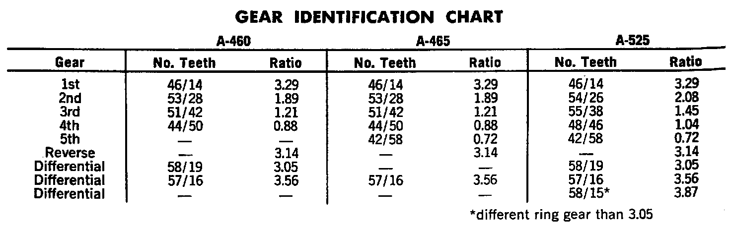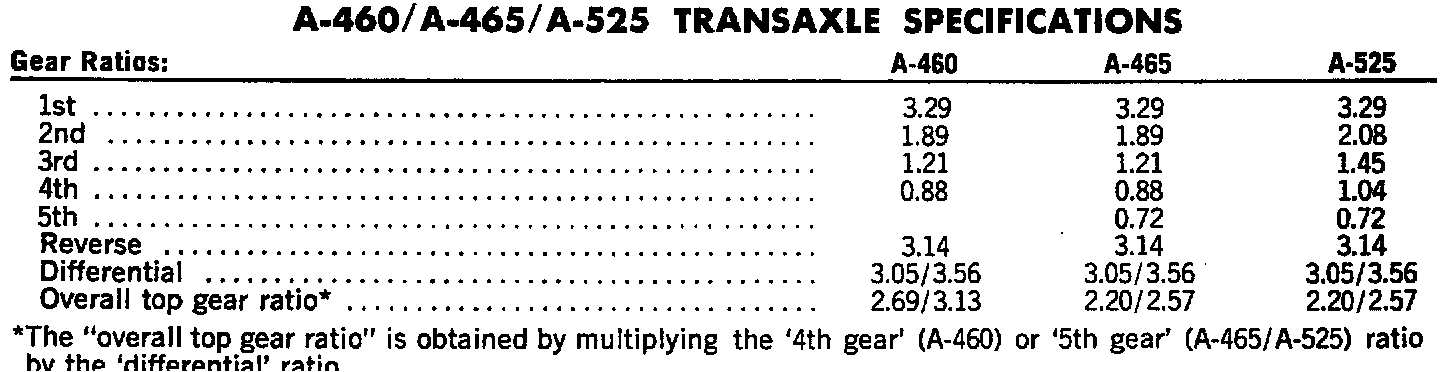 The new Chrysler designed and built A-460, A-465, and A-525 "fully-synchronized" manual transaxies combine gear reduction, ratio selection, and differential functions in one unit housed in a die-cast aluminum case. The A-460 is a four-speed while both the A-465 and A-525 are five-speeds. The A-525 has a close-ratio gear set with different 2nd, 3rd, and 4th- gear ratios than the A-465, to provide better performance through the gears, while 1st and 5th gear ratios are the same as the A-465 to maintain the same launch and top-gear characteristics.