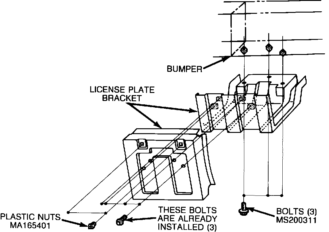 3. Align license plate bracket mounting holes with bumper holes and install the three mounting bolts MS200311 loosely.