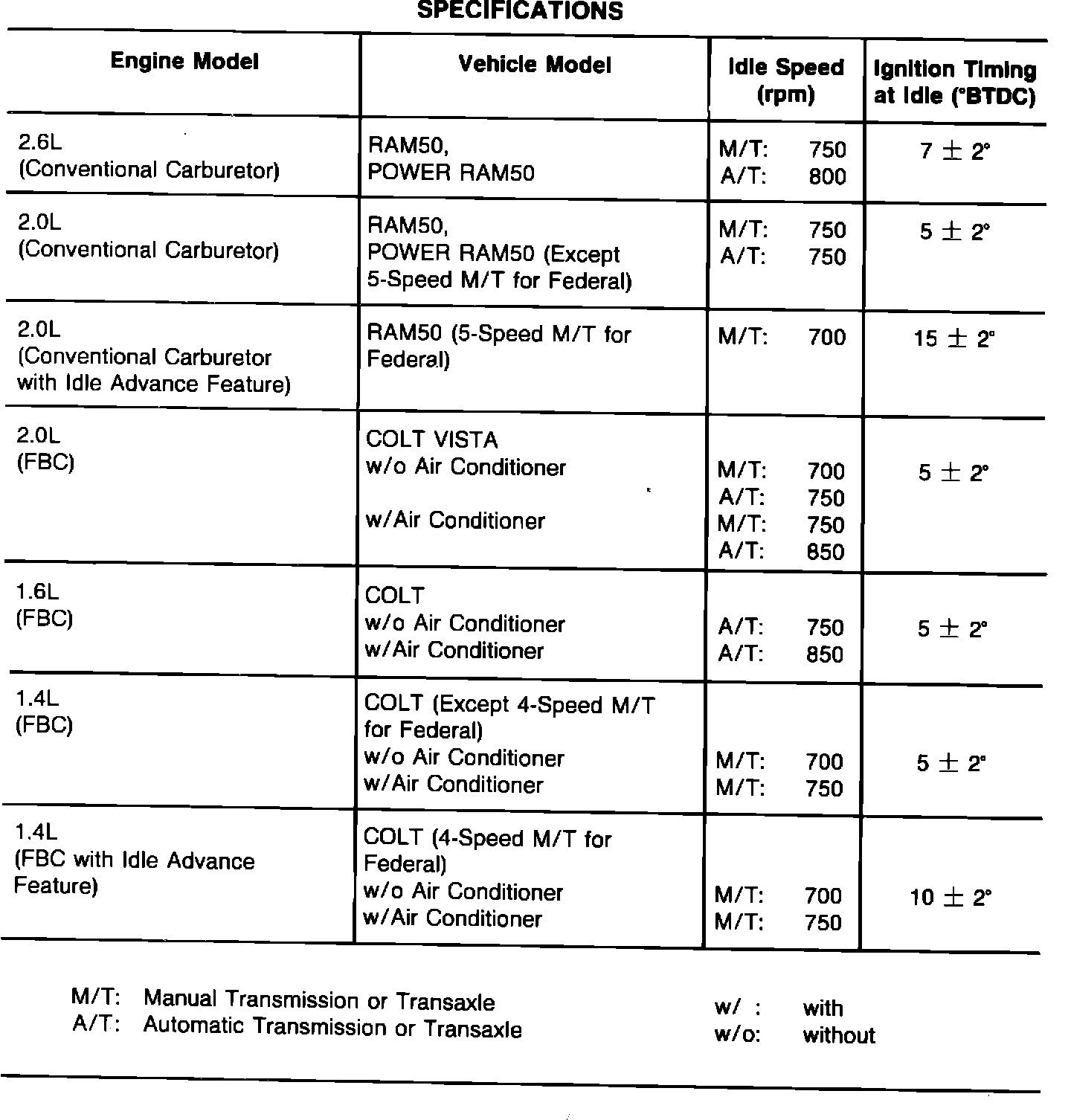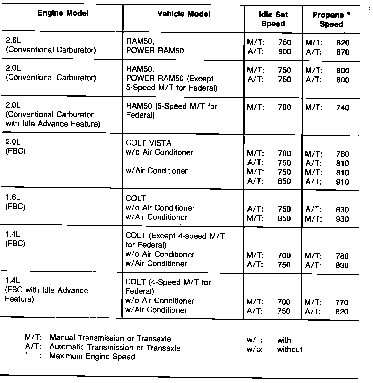 1. Idle Setting Conditions: Lights, electric cooling fan, and all accessories are off, transmission in neutral, and front wheels in straight ahead position.