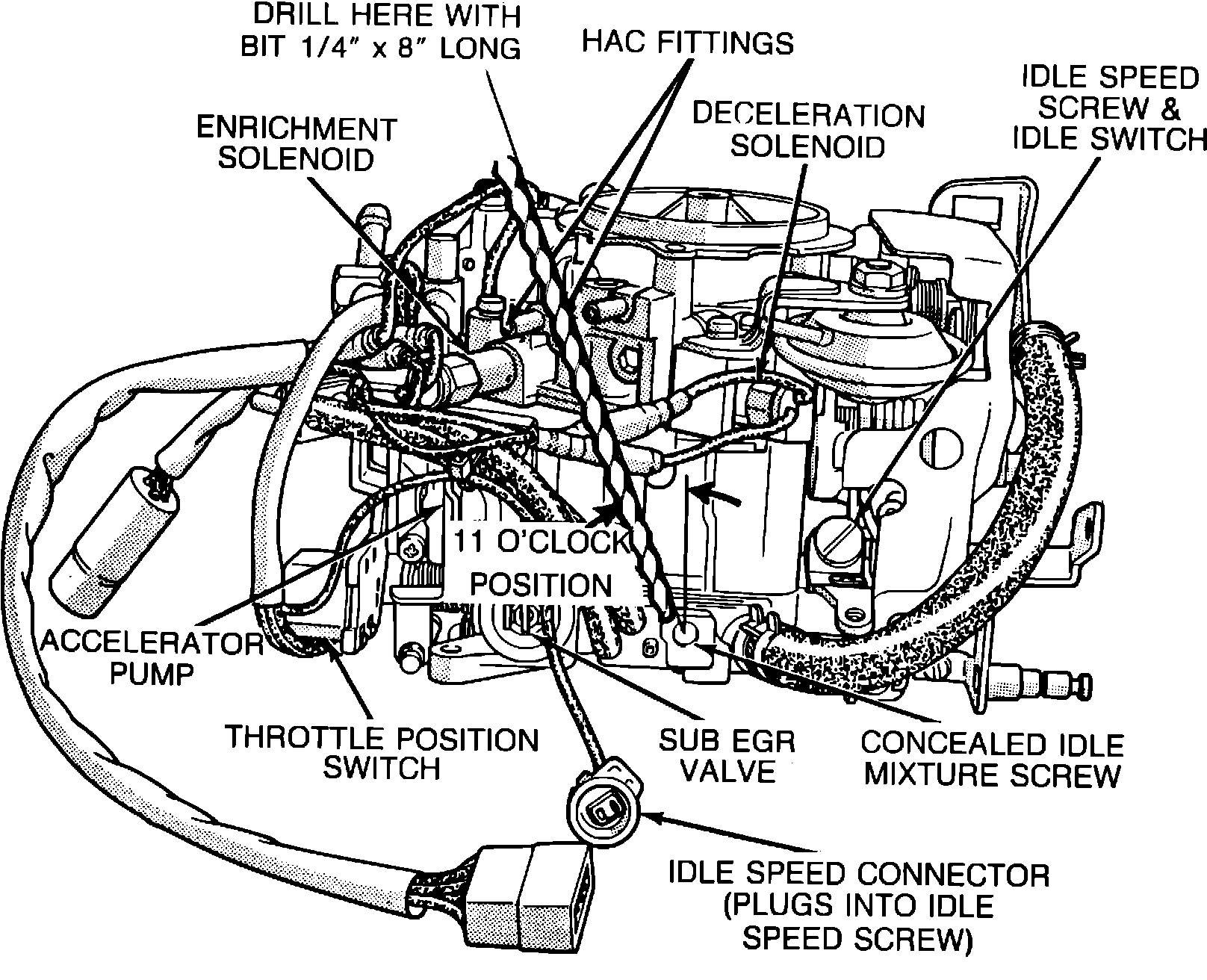 Drill out concealment plug on car. Remove vacuum connector from high altitude compensator (HAC) fittings on carburetor air horn (Figure 4).