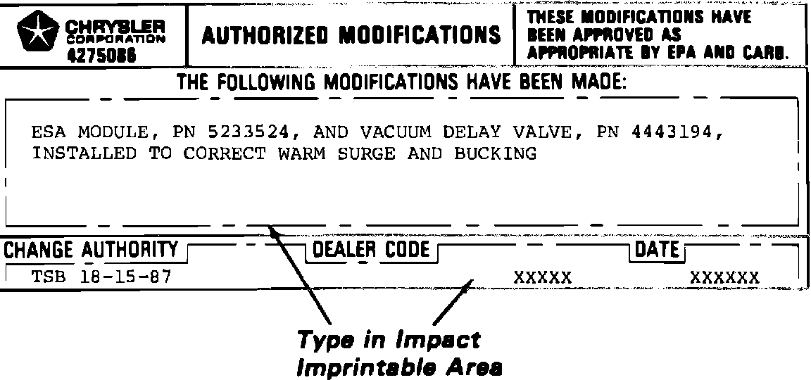This repair will reduce the above conditions by installing a revised ESA module and vacuum delay valve to allow a slightly richer fuel mixture during periods of high vacuum and high rpm.