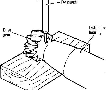 3. Assemble drive gear onto distributor shaft aligning reference marks made during disassembly, then install new roll pin, Fig. 15.