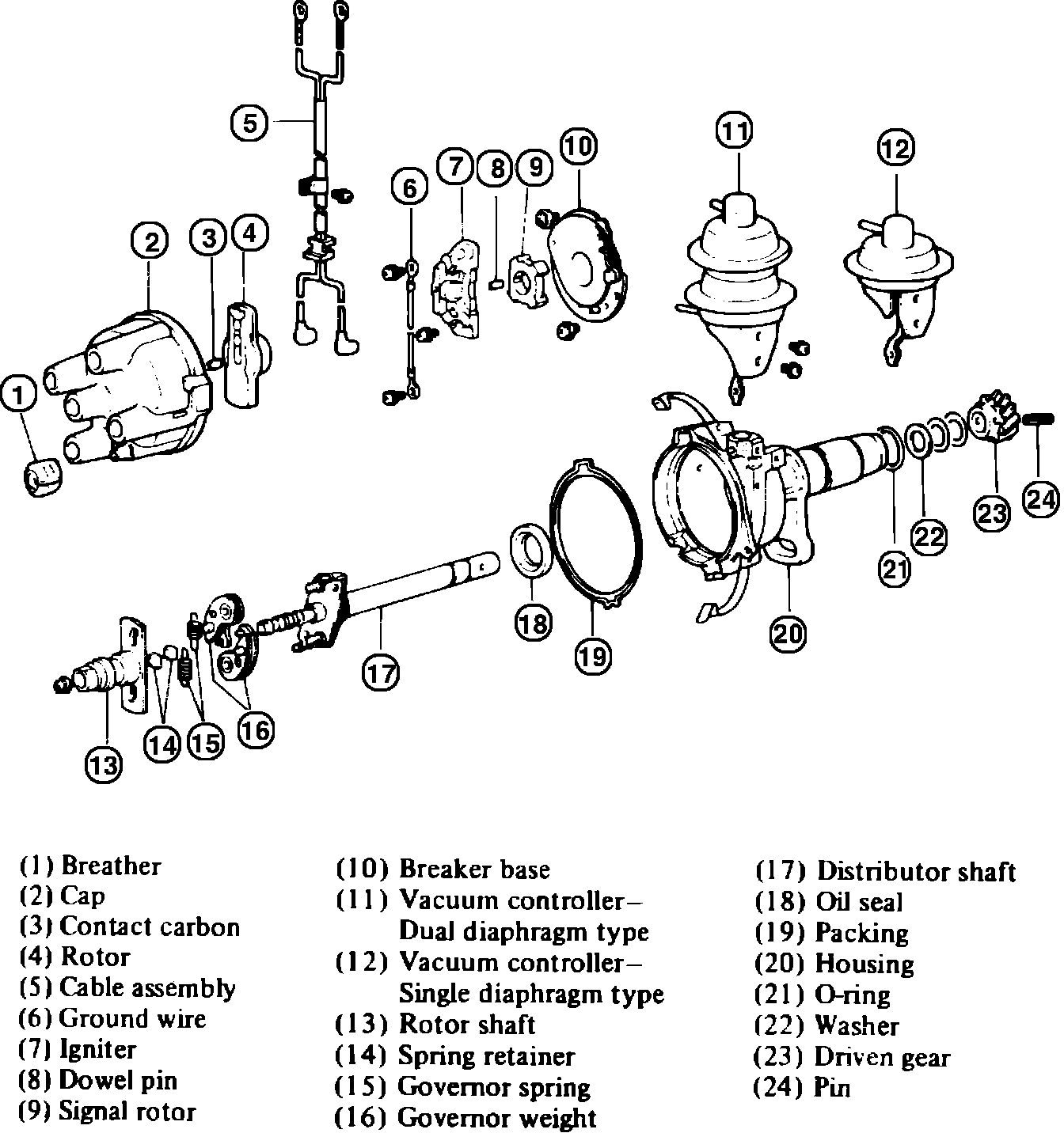Fig. 9 Exploded view of distributor. 1985 models less turbocharger, 1986-88 Colt w/1500cc engine (1986-88 Ram 50 & 1987-88 Ram Raider w/Mitsubishi distributor, similar):