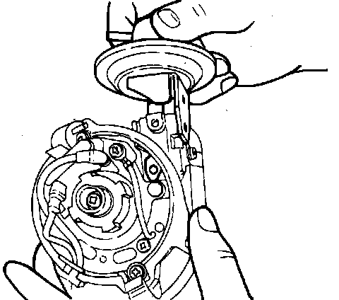 10. Connect vacuum control link to breaker plate, then insert and tighten vacuum controller attaching screws.