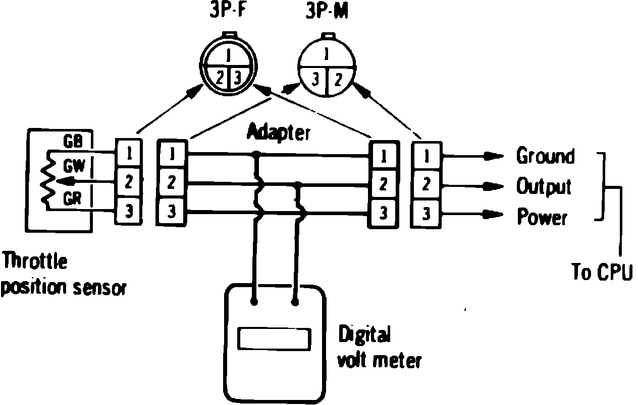 7. Disconnect harness connector at throttle position sensor, then connect digital voltmeter to throttle position sensor connector as shown, Figs. 40 and 41.